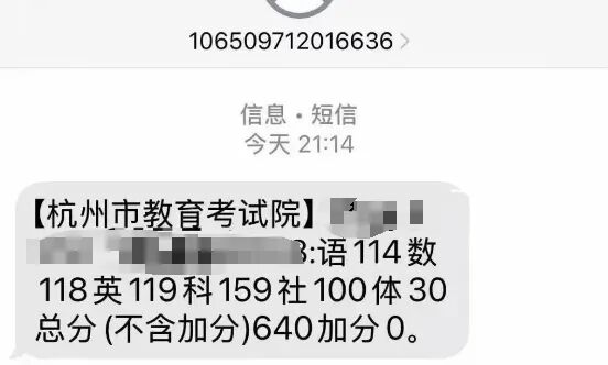 剛剛,9點多,杭州多位家長陸續(xù)收到短信,中考成績發(fā)布了。